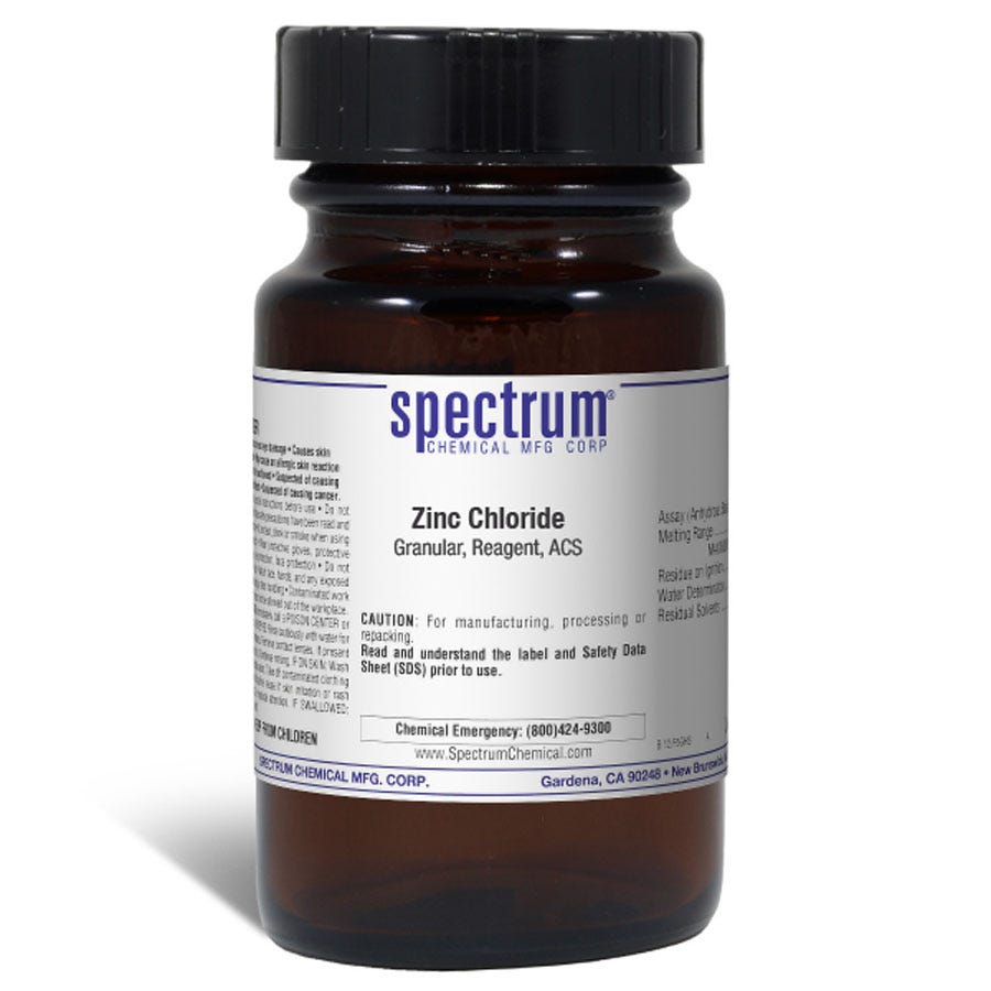颗粒状氯化锌,试剂,ACS是一种无色且吸湿的化学化合物,通常用于纺织工业、作为冶金助熔剂以及在有机合成中。它具有溶解淀粉和纤维素的能力,也可以溶解丝绸,并可应用于织物作为防火剂。在实验室中,它因其作为中等强度路易斯酸的性质而被使用。作为ACS级试剂,Spectrum Chemical生产的化合物被用作其他物质分级的质量标准,并已达到最严格的监管质量与纯度标准。