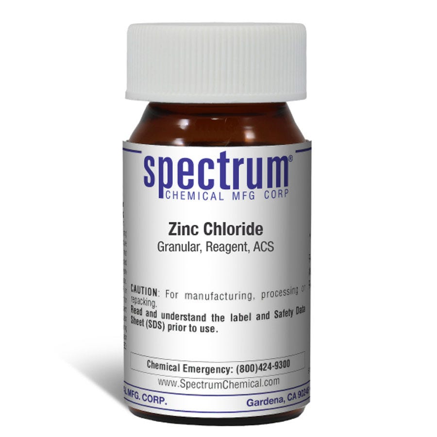 颗粒状氯化锌,试剂,ACS是一种无色且吸湿的化学化合物,通常用于纺织工业、作为冶金助熔剂以及在有机合成中。它具有溶解淀粉和纤维素的能力,也可以溶解丝绸,并可应用于织物作为防火剂。在实验室中,它因其作为中等强度路易斯酸的性质而被使用。作为ACS级试剂,Spectrum Chemical生产的化合物被用作其他物质分级的质量标准,并已达到最严格的监管质量与纯度标准。