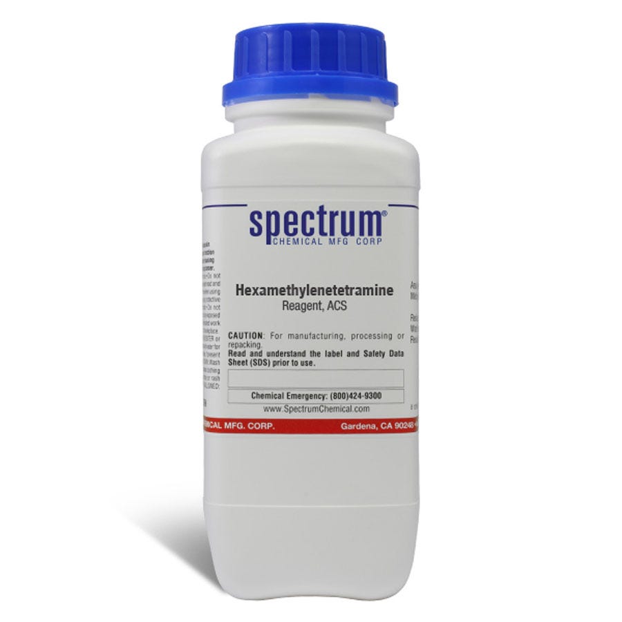 试剂级ACS六亚甲基四胺是一种白色结晶的杂环有机化合物,用于合成其他化合物。其主要用途是在酚醛树脂模塑生产中作为硬化剂、固体燃料成分、食品添加剂以及实验室中的缓冲剂。作为ACS级试剂,Spectrum Chemical制造的化合物用作其他物质分级的质量标准,并已达到最严格的质量和纯度监管标准。